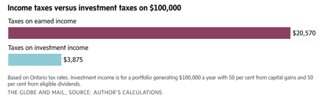 假设一名员工的年薪为 100.000 加元,而一名投资者的投资组合每年产生 100.000 加元的资本利得和股息。