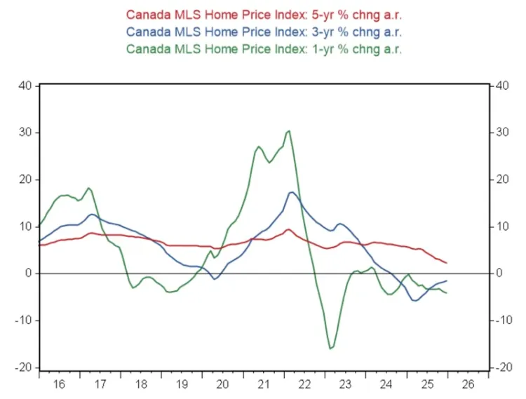 “随着市场回归到收入、利率和现金流基本面,加拿大房价继续小幅走低,”BMO 高级经济学家罗伯特・卡夫西奇(Robert Kavcic)解释道。他进一步指出,在过去三年里,房价的年化跌幅仅为 1.4%,这是在低迷开始近一年后的情况。