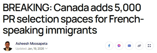 加拿大移民部在1月19日举行的新闻发布会上宣布,将额外拨出5.000个永久居民(PR)名额,供各省和地区用于接收法语背景的新移民。