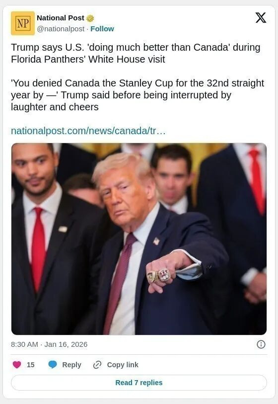 川普在受到热烈掌声后继续说道:“我们和加拿大有点小竞争。虽然他们是伟大的人,但没关系,我们做得比加拿大更好,对吧?我们希望他们也能做得好,他们会做得好的”。川普的这番话再次让美国与加拿大的冰球竞争成为焦点。黑豹队在上赛季的斯坦利杯决赛中击败了埃德蒙顿油人队,这意味着加拿大再延续冠军荒。自1992-93赛季蒙特利尔加拿大人队夺冠以来,所有加拿大队伍都未能再夺得斯坦利杯。