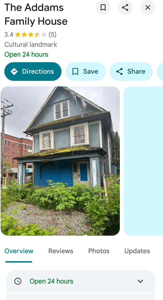 也不知道是哪位人才在谷歌地图上搞事,直接把房名改成了“The Addams Family House(亚当斯一家)”,分类还是“文化地标”。