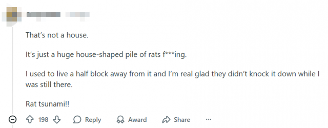 网友A吐槽:“这哪是什么房子啊?根本就是个披着房子外皮的‘巨型老鼠窝’,还是天天开派对的那种。我以前就住它旁边半条街,幸亏他们没在我住时拆了这窝——不然怕是要炸出一场‘老鼠海啸’了。”