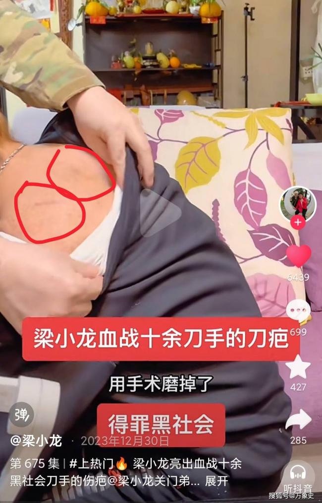 随即梁小龙向徒弟展示当年那一场血战中他身上留下的伤疤,背上有好几道刀疤,手臂上的其中一道刀疤当年缝了11针。