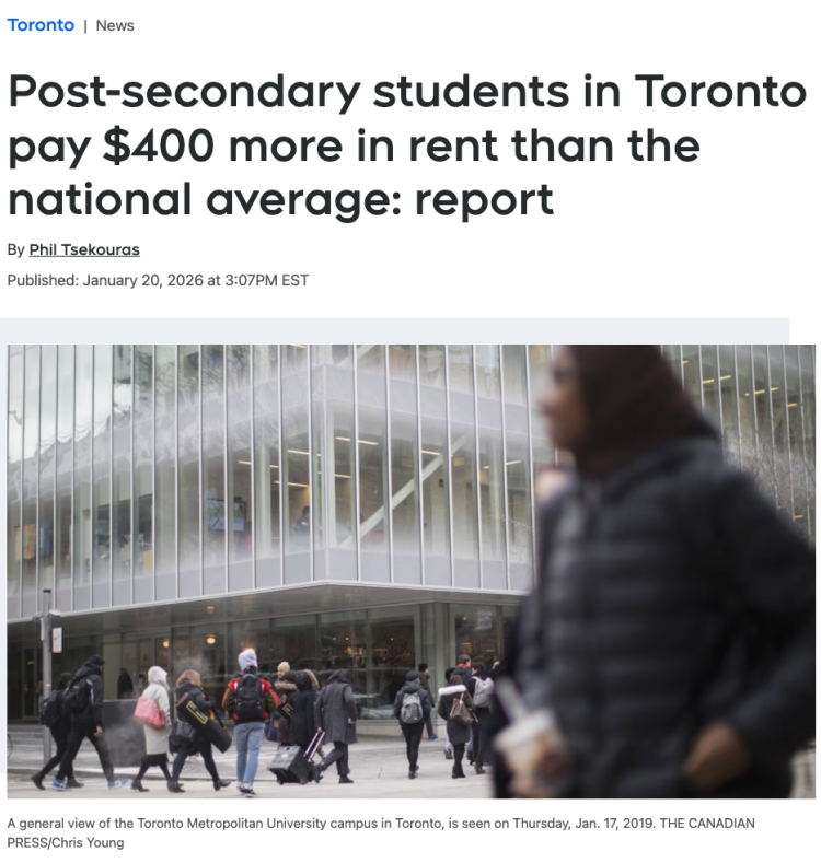 多伦多大学和多伦多都市大学(TMU)的学生每月房租中位数高达1550加元,比其他地方高出约400加元。约克大学未被纳入该报告。