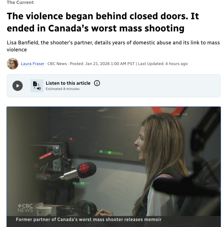 多年间,丽莎·班菲尔德(Lisa Banfield)一直保持沉默,她的声音被交往 19 年的伴侣压制——一个在这段关系大部分时间里对她进行身体和心理虐待的男人,最终在 2020 年 4 月,在加拿大新斯科舍省农村地区 13 小时内杀害了 22 人。