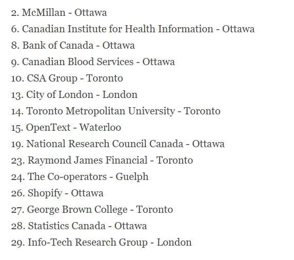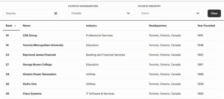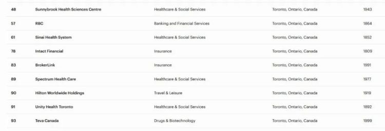 作为安省乃至加拿大的经济中心,多伦多同样是优秀雇主的聚集地。在总榜前100名中,总部位于多伦多的雇主包括以下16家: