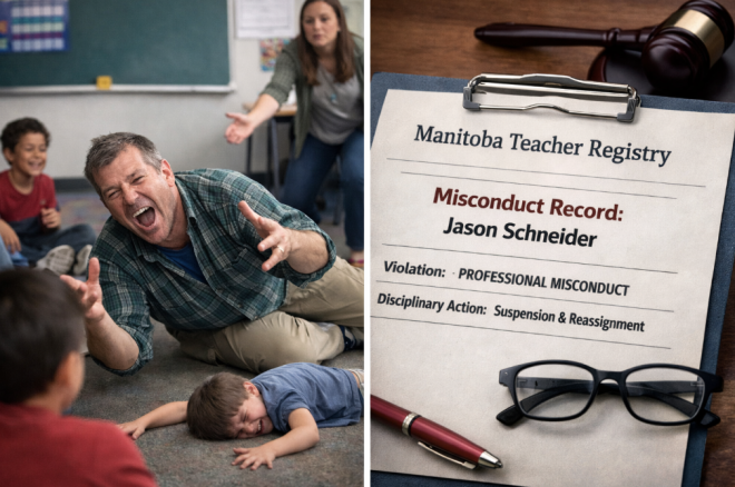 教师背景与事件概述教师Jason Schneider自1996年起持证任教。根据曼尼托巴省教师职业行为专员(Commissioner of Teacher Professional Conduct)发布的协议,Schneider在2025年4月发生在他负责的3/4年级混合班的事件调查后被纪律处分。