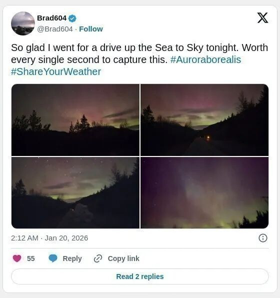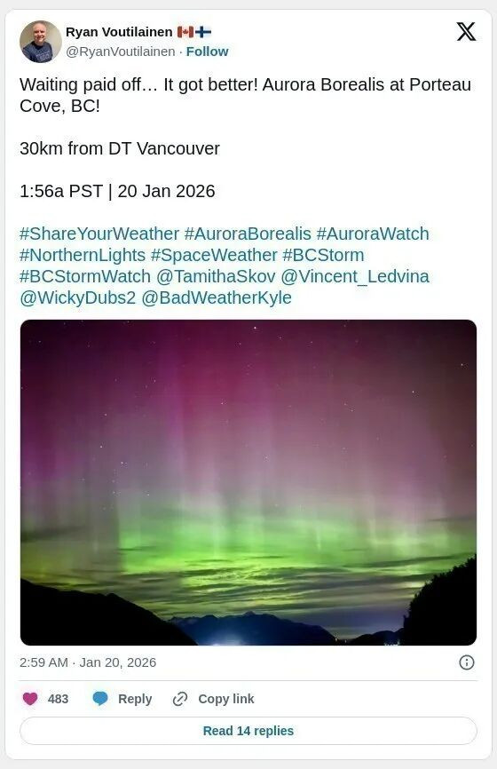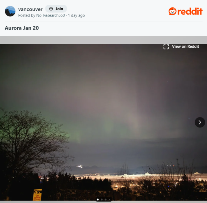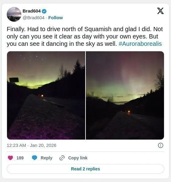 此外,高贵林兰(Coquitlam)的Trish Van Leeuwen于凌晨2时拍下舞动的极光,北温的Andrew Chin也记录了这一奇观。AJ Reid称在温哥华市区上空看到了极光,但未透露具体地点。