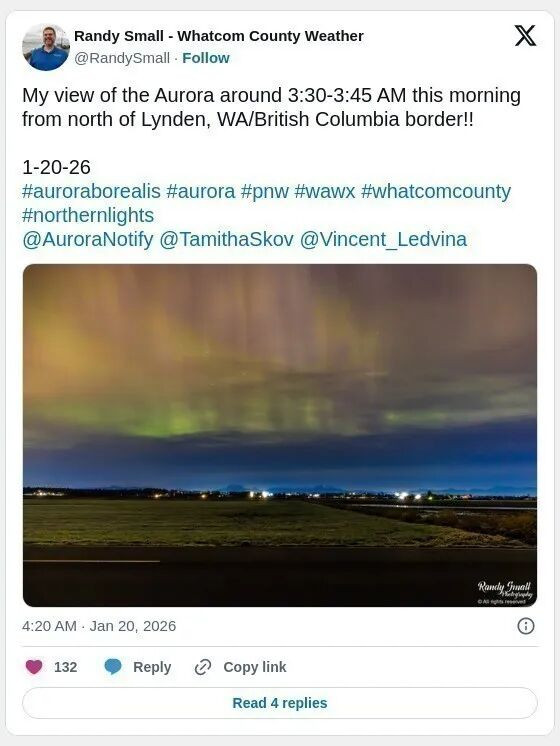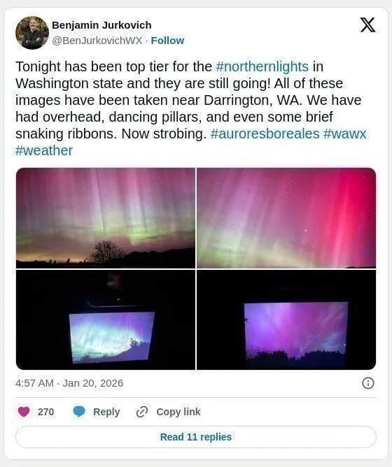 不仅如此,美国华盛顿州的摄影爱好者也捕捉到了壮观的极光景象。
