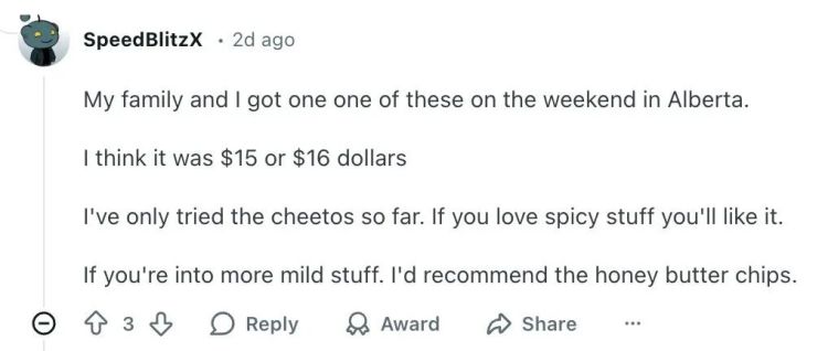 有网友分享了自己在阿尔伯塔省(Alberta)购买的经历:“我和家人周末刚在阿省买了一箱,大概是 15 到 16 加元。我目前只试了奇多(Cheetos),如果你很能吃辣,应该会喜欢。如果偏好口味清淡一点,我会推荐蜂蜜黄油薯片。”