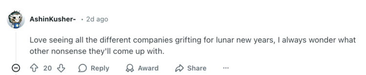 有网友表示:“我很喜欢农历新年。虽然我不是东南亚裔,但我在一个以华人社区为主的环境中长大,有很多关于春节的童年回忆。所以看到西方大公司这样拿春节来赚钱,真的让我觉得很不舒服。”