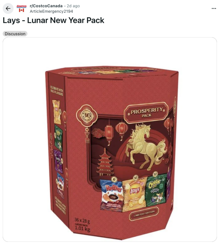 农历新年临近,加拿大各大超市的“春节限定款”陆续上架。然而近日,一款在 Costco Canada 上架的乐事(Lays)农历新年混合装礼盒,却在社交平台 Reddit 上引发了不小争议。