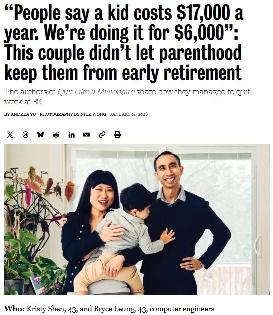很多人都有提前退休的梦想,加拿大一对华人夫妻花了三年时间省吃俭用存足$100万,32岁时就提前退休。此后他们生了个孩子,并把养娃孩子的开支控制在每年6000.彻底推翻了孩子是“碎钞机”的论调。