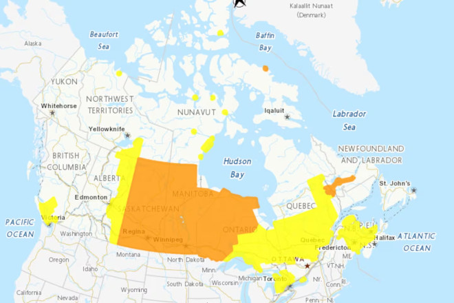 加拿大环境部今晨已对整个萨斯喀彻温省、曼尼托巴省,以及安省北部大部分地区发布橙色极端天气警报。