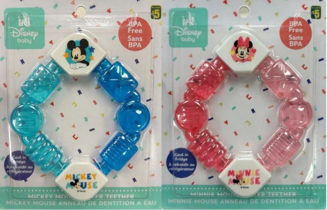 此次召回涉及迪士尼婴儿水牙胶,型号为3121188.这款牙胶有两种款式,均为中空八边形,带有纹理。一款为蓝绿色,印有米奇图案;另一款为粉色,印有米妮图案。
