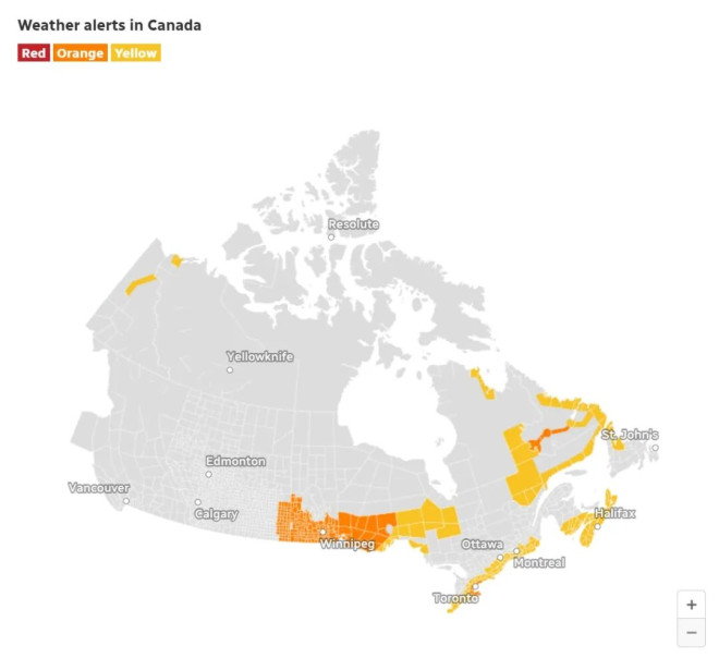 加拿大环境部(Environment Canada)已对多个省份发布橙色天气预警,意味着极端天气可能造成严重破坏、交通中断和健康风险。