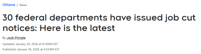 三大联邦工会提供的数据显示,截至目前,已有30个联邦部门在12月和1月向员工发出了相关通知。发放“人员调整通知”(workforce adjustment notice)是整个流程的一环,但收到通知并不等于一定会被裁员。仅在过去两周内,就已发出超过1.5万份通知,其中1月18日当周就发出了约1万份。