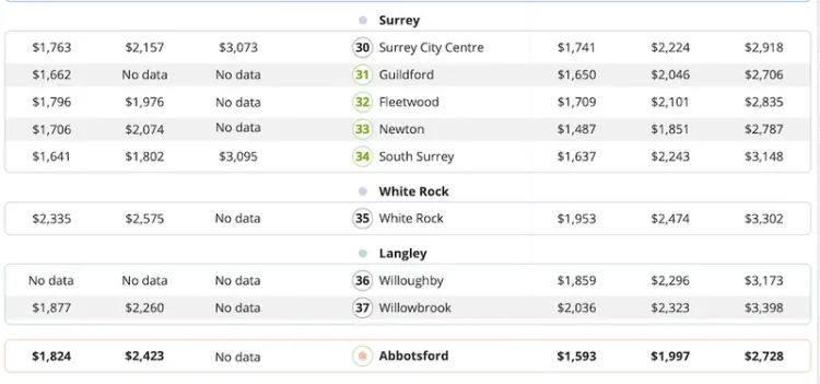 紧随其后的,是阿伯茨福德,平均1593加元。对不介意通勤、或者本就在菲沙河谷工作的人来说,这个价格相当有吸引力。