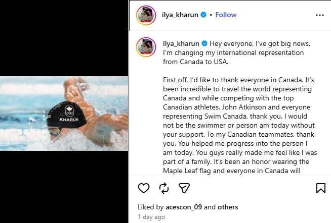 加拿大20岁泳将卡伦(Ilya Kharun),本周一突然宣布:未来将不再代表加拿大参赛,而是改披美国战袍。他曾在2024年巴黎奥运会上为加拿大赢得两枚铜牌。