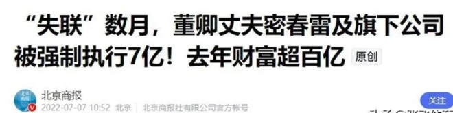 在此期间,密春雷被法院列为失信被执行人,累计执行标的超过9亿元,名下宾利车队被扣押,洛杉矶豪宅以899万美元挂牌出售。 董卿则默默变卖多处房产帮丈夫还债,甚至搭上多年积蓄。