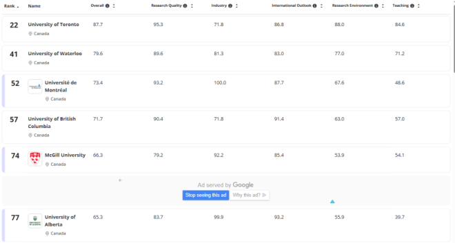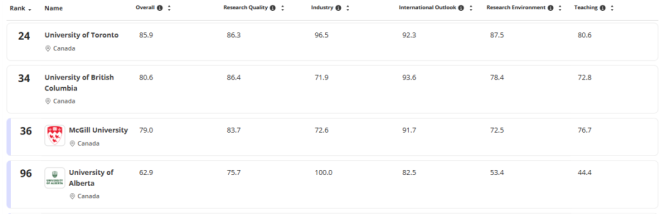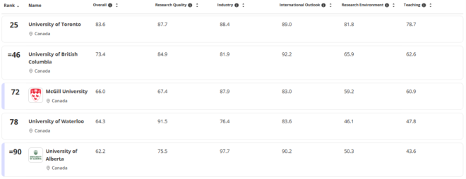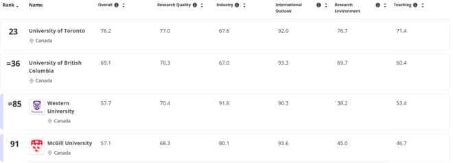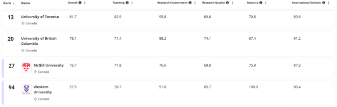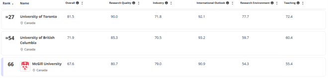 不只多大,加拿大其他大学也很能打