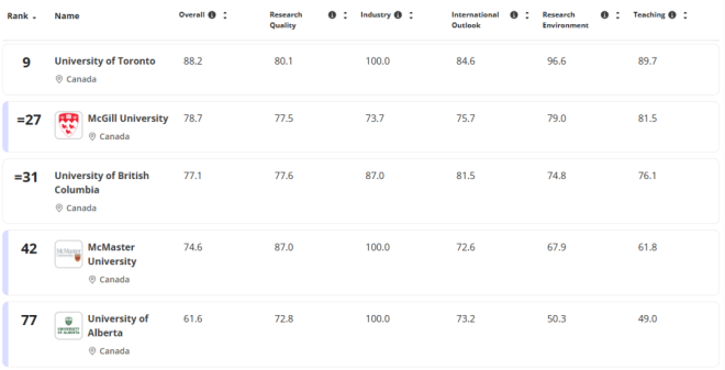 在本次THE学科排名中,加拿大并非只有多大在“发光”。以下是在11个主要学科中进入全球前100的加拿大高校代表: