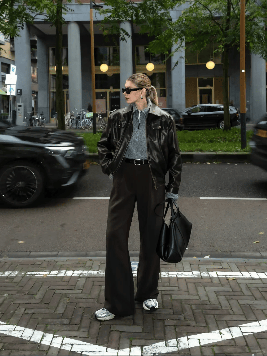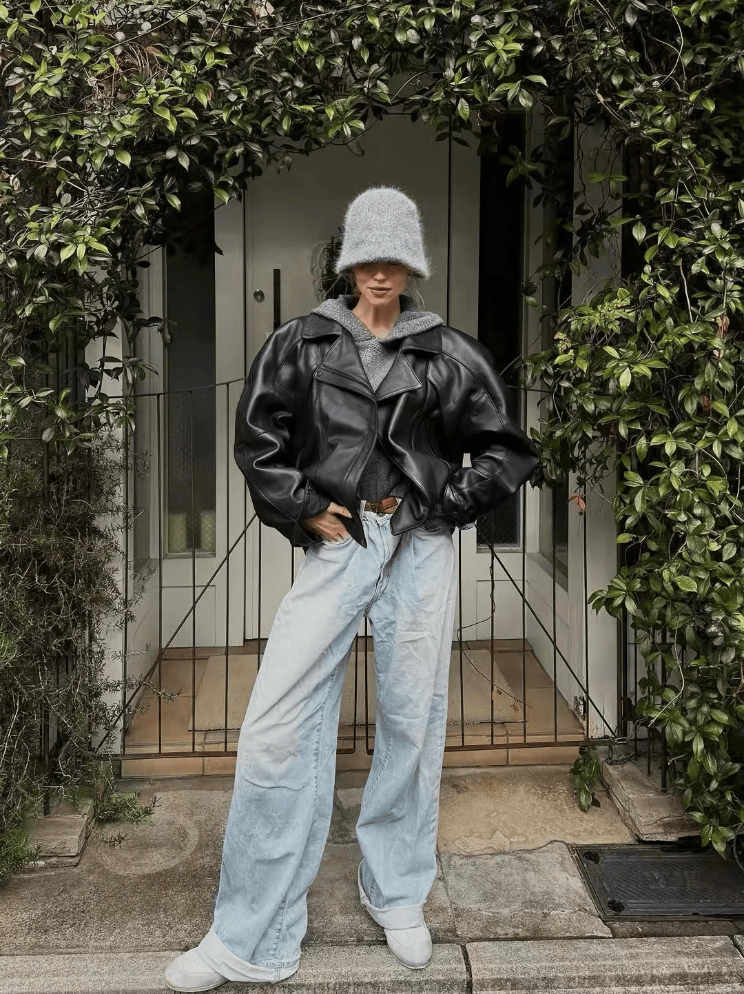 剪裁利落的皮质短上衣与牛仔阔腿裤的结合,