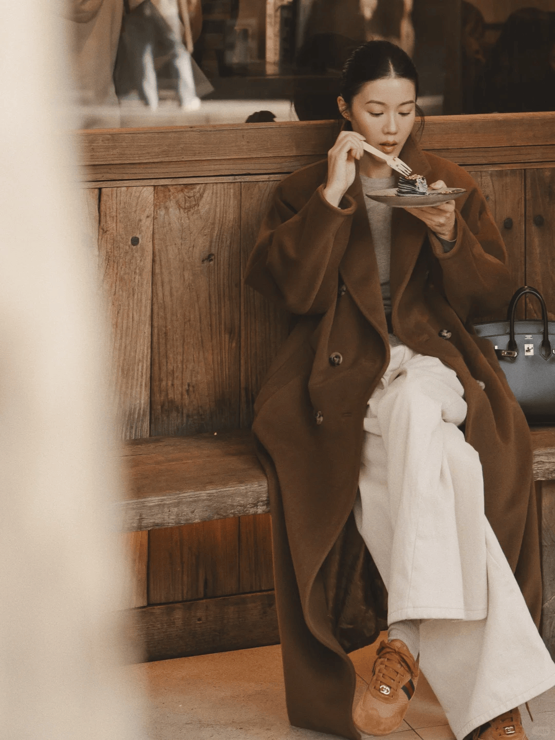 一件剪裁精良的羊毛大衣保持着挺拔轮廓,
