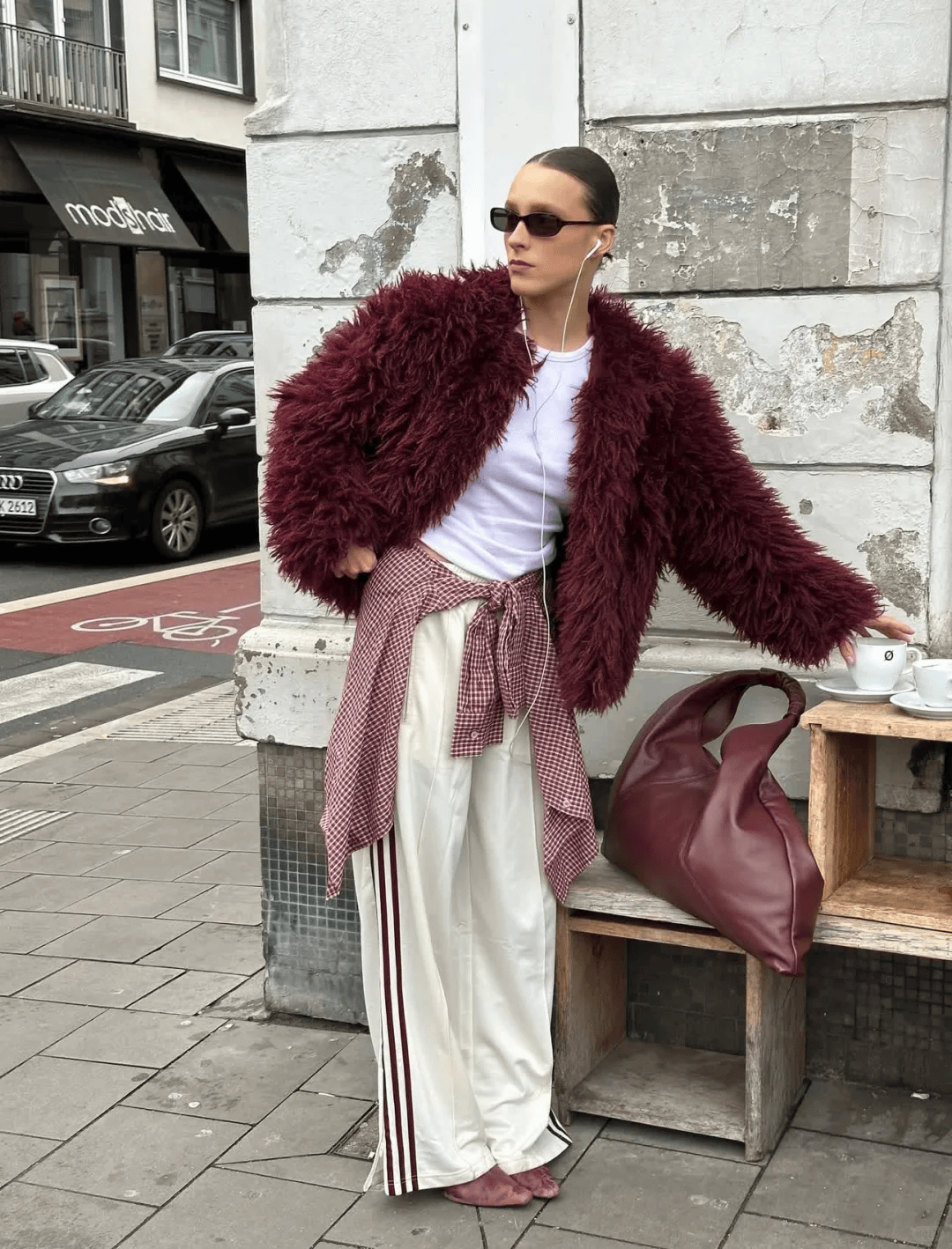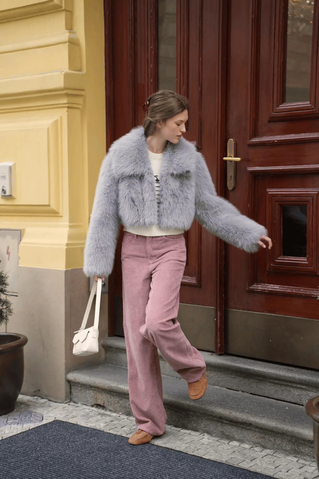 一件皮毛一体的短上衣与阔腿裤的搭配,