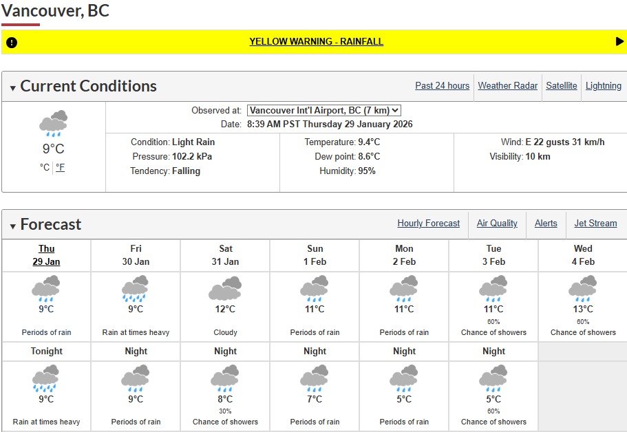 加拿大环境与气候变化部(Environment和Climate Change Canada)已对大温地区部分区域发布黄色降雨警告。