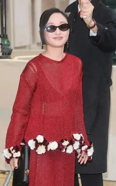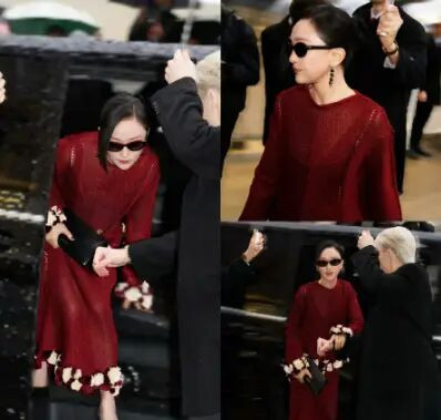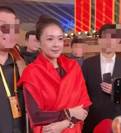 她身穿一套红色造型,颜色大胆却不张扬,反而把整个人的气色衬得格外通透。