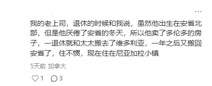 但气候党的快乐,有人根本 get 不到:“我老上司,退休卖了多村的房搬去维多利亚,一年后搬回安省 —— 住不惯,现在待在尼亚加拉小镇。”