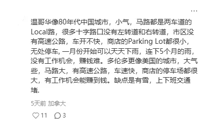 有网友直接把俩村扒光:“温哥华像 80 年代中国城市 —— 小气,马路是两车道 Local 路,十字路口没转向道,市区没高速,车开不快,停车场小到没处停;一月开始天天下雨,连下 5 个月,没工作机会赚钱难。多伦多更像美国城市 —— 大气,马路宽、有高速、车速快,停车场敞亮,有工作机会能赚钱;缺点是有雪,上下班堵死。”