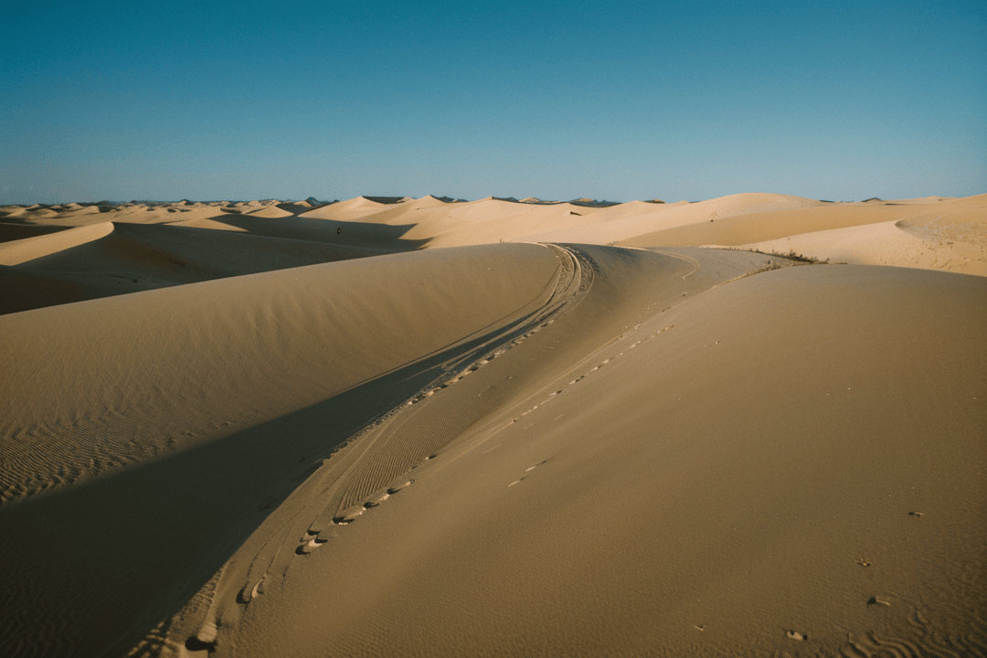 随着太阳逐渐升高,光线变得均匀。沙丘颜色趋于明亮,阴影范围缩小,强调出沙海的延展感。视野中的元素减少,却让空间显得更加辽阔,使人更容易感受到尺度的变化。