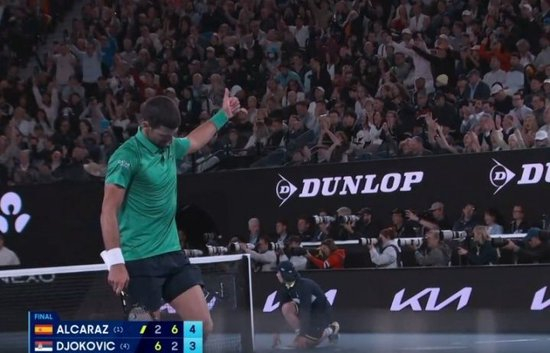 第7局比赛,德约发球局,双方第二分非常精彩,阿尔卡拉斯两度极限救球最终成功得分,德约向其竖起大拇指。本局德约保发,局分3-4落后阿尔卡拉斯。