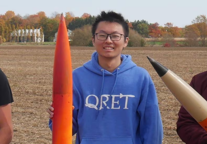 其中一张照片里,这名面带笑容的年轻男子身穿Queen's Rocket Engineering Team(QRET)连帽衫,手持一枚亮橙色火箭。