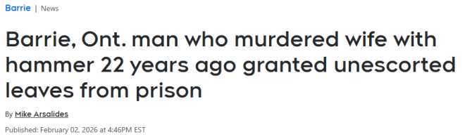 一名来自安省巴里(Barrie)的男子,22年前当着自己孩子的面杀害了妻子、目前正在服无期徒刑,如今获准可以无需狱警陪同、临时离开监狱。
