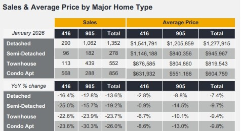 1月GTA独立屋平均价格同比下降7.4%,至$1.277.915;公寓平均价格同比下降9.8%,至$604.759.
