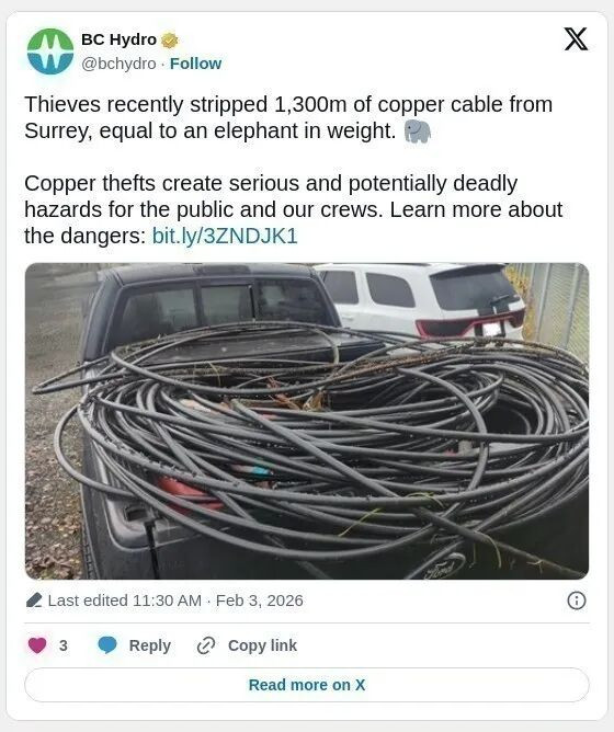 BC Hydro指出,就在该案件被发现前13天,公司曾发布公告称,过去18个月内,从地下维修井盗窃铜缆的案件数量激增超过300%。公司当时警告,这类盗窃行为“不仅代价高昂,而且可能致命”,因为切割铜缆的危险程度与破坏带电电力线路相当。