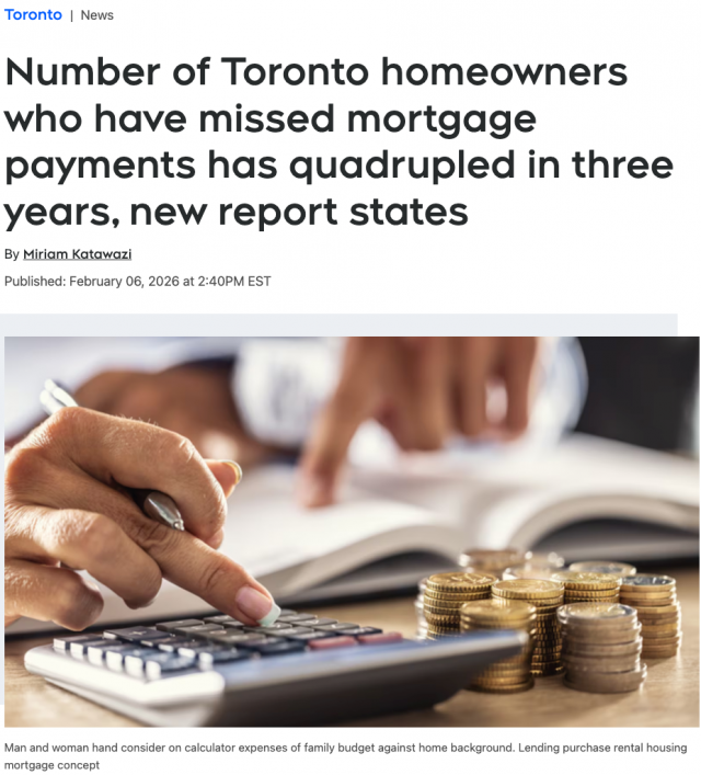 一份最新报告显示,过去三年里,多伦多每月难以偿还房贷的房主数量增加了四倍多,到2025年第三季度,大多伦多地区近2800名名房主没钱交房贷。