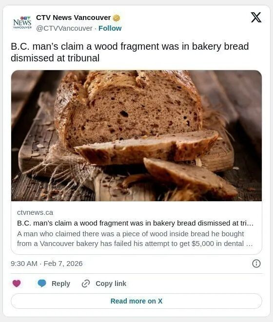 温哥华一名男子声称,他从当地面包店购买的面包中咬出一块木片,试图向BC省民事解决法庭(B.C. Civil Resolution Tribunal,CRT)索赔 5.000 加元的牙科费用及精神损害赔偿,但最终未能成功。