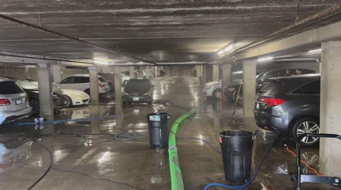 温哥华公寓停车场竟成了游泳池 数十辆汽车被泡