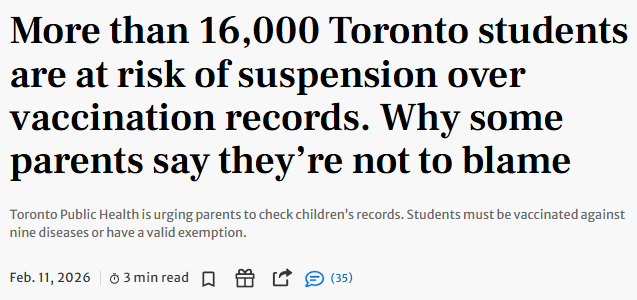 多伦多公共卫生局(TPH)敦促家长尽快核查孩子的接种记录,及时补种疫苗,并主动上报已完成的接种信息。否则,从3月开始,违规学生可能面临长达20个学日的停学处分。