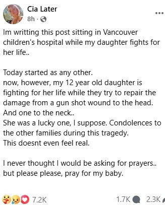 其中一名重伤者为12岁女孩 Maya Edmonds,她头部和颈部中弹,目前在温哥华BC儿童医院抢救,情况危急。