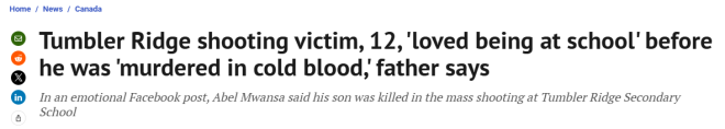 一名因Tumbler Ridge校园枪击案失去儿子的父亲在社交媒体上表达了深切哀痛。他说,自己12岁的儿子非常喜欢上学,以至于当父亲曾提议在家上学时,他还哭了。