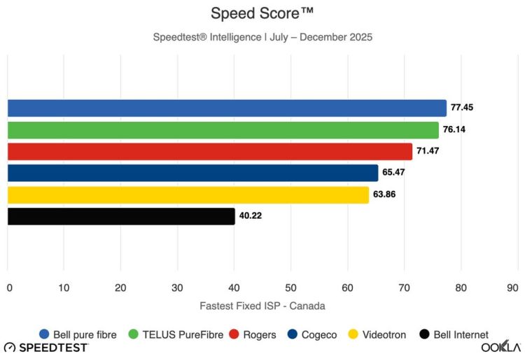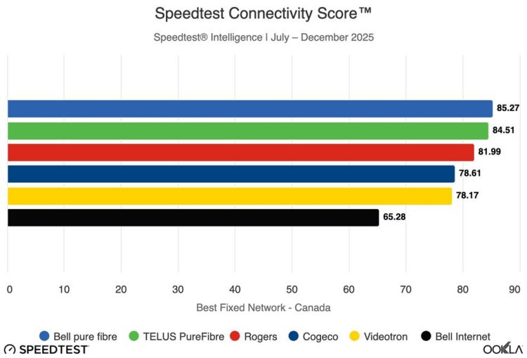 根据 Ookla 的数据,Bell pure fibre 在加拿大所有互联网服务商中拥有最佳固定网络,Speedtest 连接评分为 85.27.