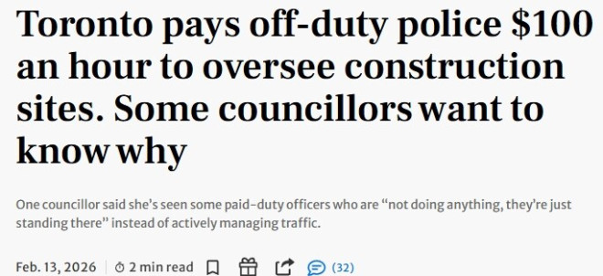 多伦多市去年花费近600万元,用于雇佣“带薪执勤警员”(Paid Duty Officers,简称PDO)监管道路施工现场,部分市议员质疑这些时薪接近100加元的警员是否物有所值。
