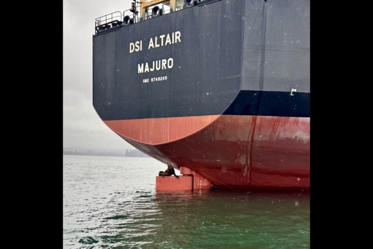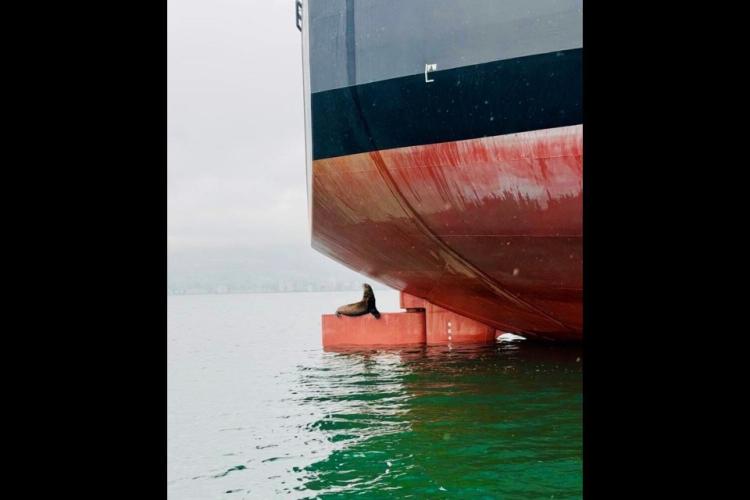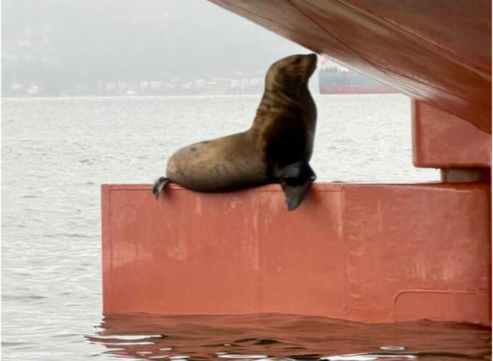 本周一,拉格林和其他船舶检查员见证了不同寻常的一幕:只见一只海豹浮出水面,悠闲地躺在一艘停泊于锚地的大型货轮的船舵上。