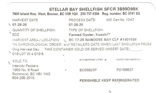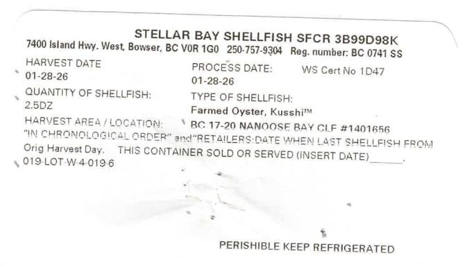 此次召回的生蠔来自Stellar Bay Shellfish公司,于1月28日至29日在纳努斯湾 (Nanoose Bay) 地区捞获。