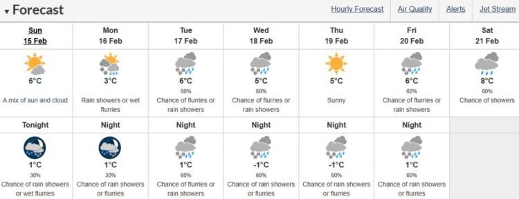 ECCC 还表示,本星期晚些时候,随着一股“寒冷不稳定的气团”在该地区上空盘旋,周二至周四可能会出现“局部强降雪”。